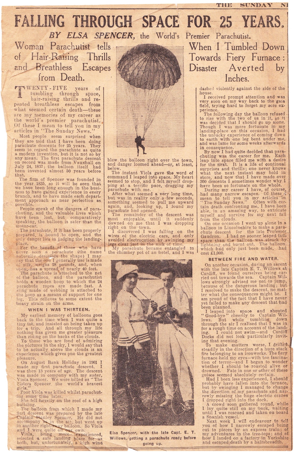 In this final newspaper article from 1930, Elsa basically recaps most of the highlights of her career. She had finished her parachuting back in 1927, and the government banned all parachuting from balloons in 1932.