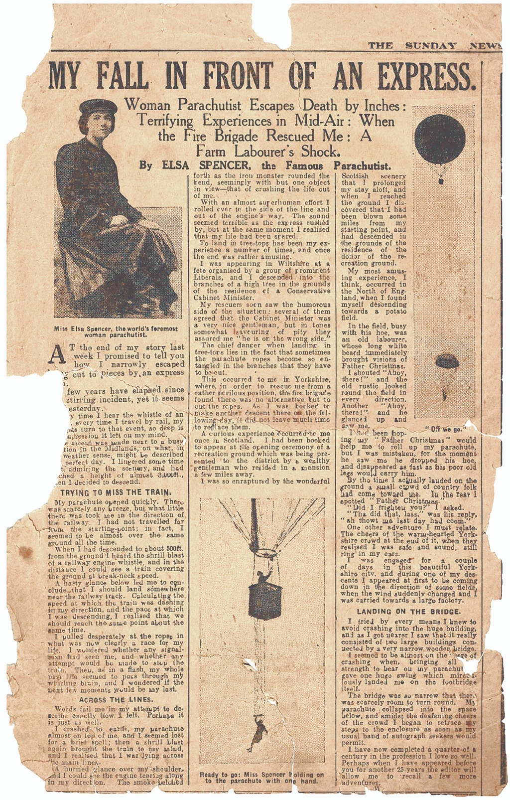 In Elsa's second newspaper article from 1926, she relates a few of her hair raising adventures; one where she lands on a railway track. She judges that she will likely land right infront of the train. She manages to roll off the track in the nick of time. On another occasion she lands in a high tree and is rescued by the fire brigade. In Yorkshire she appears out of the sky and almost causes a poor "Father Christmas Bearded "farmer to have a heart attack. Incredibly as she faces almost certain death on many occasions, she doggedly continues her craft. It should be pointed out that she did not have the luxury of wearing a harness or a reserve parachute she simply descended by hanging on-sometimes with one hand on to a hoop or trapeze bar.