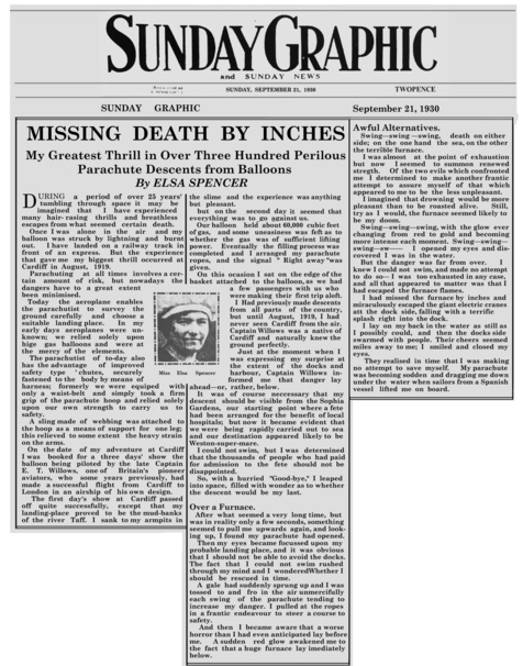 In 1901, a 17 year old girl went up in a balloon in England. She had never parachuted before and on her first descent she landed against the wall of a pub and was rendered unconscious. This was no ordinary young woman, as the next day, her 18th birthday she went up again- on her own and this time parachuted and landed safely. She went on to repeat this more than 300 times and became Britain's greatest pioneer parachutist.